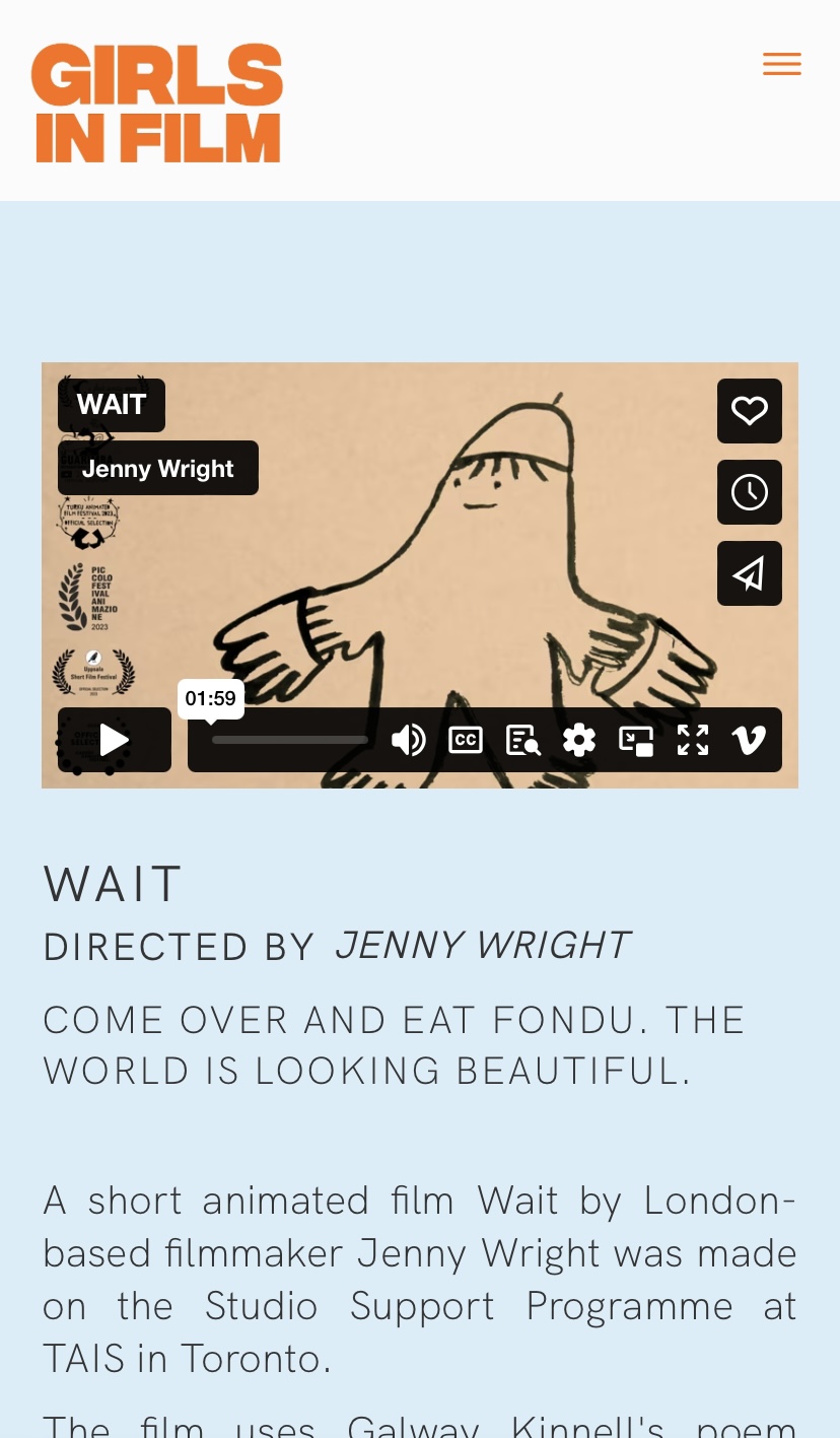 The physical process of painting under the rostrum as well as the development of Wait were hugely therapeutic and fun! I will now part with the film and give it to audiences who will hopefully feel something from it, as I have.